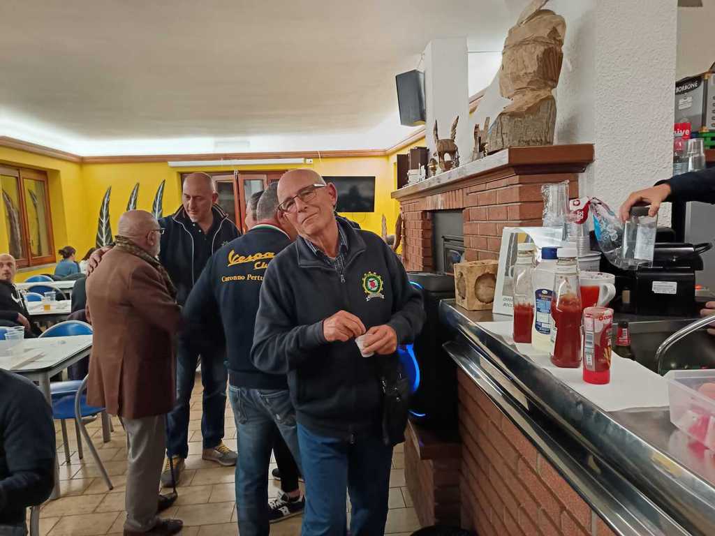 06/ OTTOBRE LA TEMPERATURE è BASSA MA IL MORALE è ALTO ,SIAMO PRONTI A PARTIRE ,DESTINAZIONE CALDANA MA , PRIMA UNA RIPARAZIONE VELOCE . UN FILO DELLA FRIZIONE DA SOSTITUIRE .STRADA FACENDO SI BUCA UNA RUOTA ,PER FORTUNA NESSUNO SI FA MALE E LA SOSTITUZIONE DELLA GOMMA AVVIENE CON LA STESSA MODALITA DELLE FORMULA 1 , VELOCISSIMA, 20 MINUTI . GIUNTI A DESTINAZIONE SI PARCHEGGIANO LE VESPE E POI SUBITO A MANGIARE UN PANINO CON LA "MORTAZZA" , BREVE GIRO TRA LE BACARELLE E POI A TAVOLA A GUSTARE I PIATTI LOCALI DI STAGIONE .CON L'OCCASIONE SI FESTEGGIA IL NUOVO "UMAREL" DEL CLUB. ROMANO FINALMENTE è IN PENSIONE . PURTROPPO LA FESTA FINISCE E SI DEVE TORNARE A CASA . CI SI FERMA AL DISTRIBUTORE PER RIFONIRE QUELLE VESPE CHE CONSUMANO UN PO DI PIù DELLE ALTRE E POI TUTTI IN FILA SI TORNA .