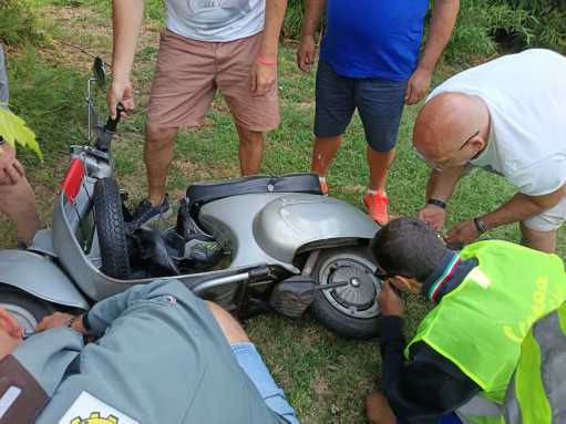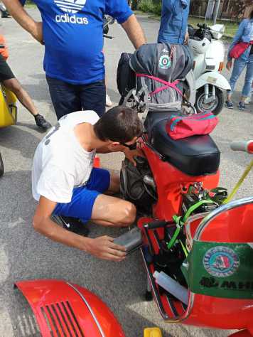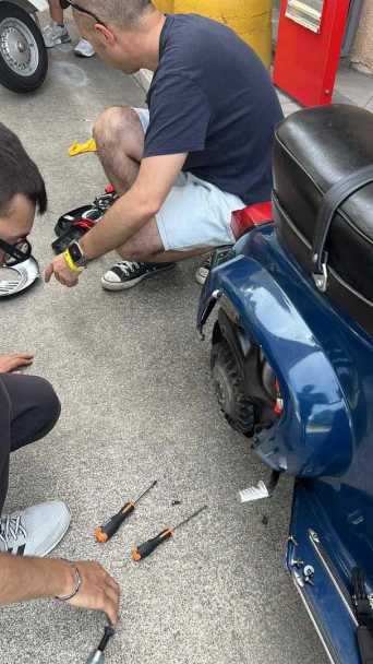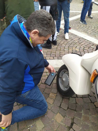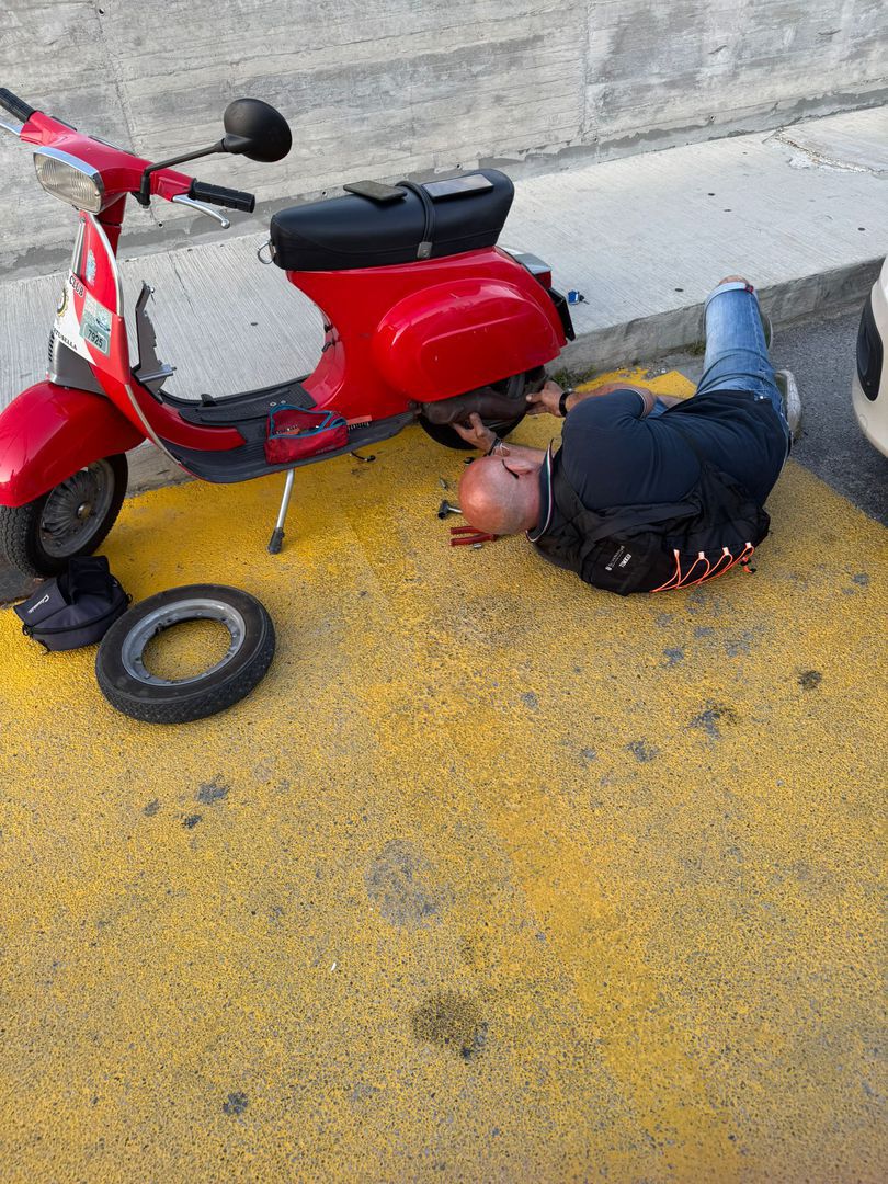 ANCHE QUESTA VESPA HA LA RUOTA SGONFIA , E IL NOSTRO SOCIO SI OFFRE VOLONTARIO PER GONFIARLA VISTO CHE IL PROPRIETARIO DI QUESTA VESPA DICE CHE NON SA USARE UN COMPRESSORE .